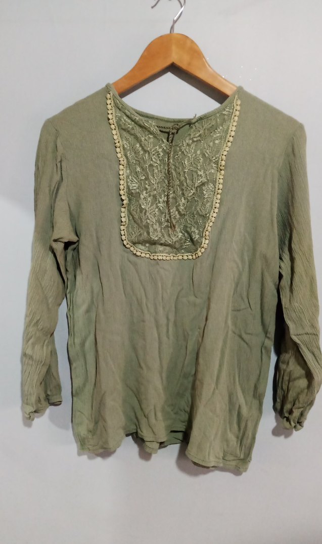 Yumuşak keten kumaştan yapılmış, boy 62 göğüs 52 cm M beden uzun kollu, nakış detaylı, düğmeli ön panelli bej bohem tarzda bol kesim bluz. Günlük kullanım için uygun.