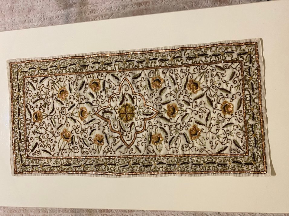Detaylı nakışlı, bej ve gri renklerde bohem stilinde masa örtüsü. Zarif çiçek desenleri ve işçilikle süslenmiştir.