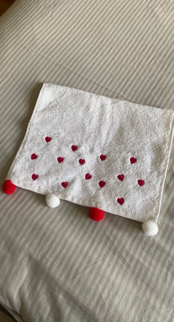 Renkli nakışlı kalpli ve ponpon detaylı, bohem tarzda beyaz havlu. Yumuşak ve dekoratif kullanım için uygundur.