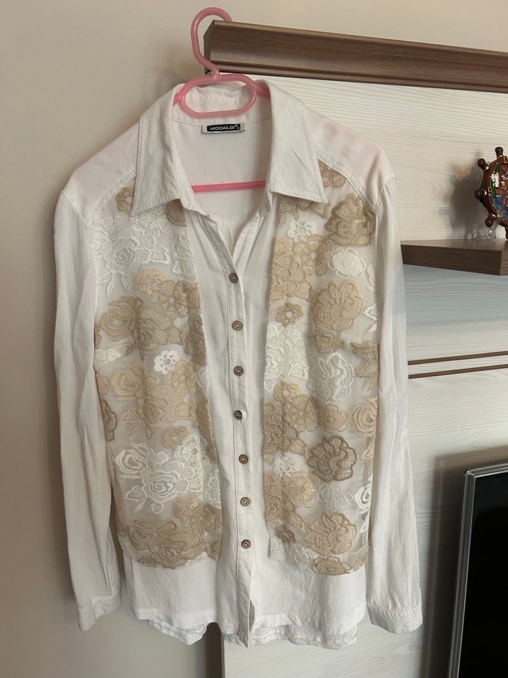 Beyaz keten gömlek, yakalı, uzun kollu ve bol kesimdir. Düğmeli ve nakışlı çiçek desenleriyle bohem tarzı yansıtır.