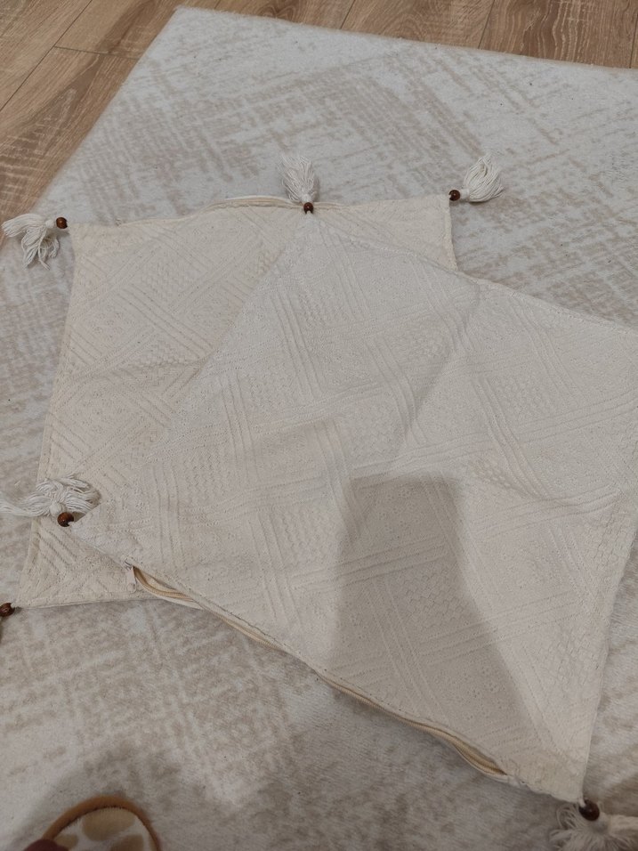 Bohem tarzda, köşelerinde püsküller bulunan beyaz nakışlı ve gri detaylı kırlent kılıfı. Mekana dokulu ve sanatsal bir hava katar. ️