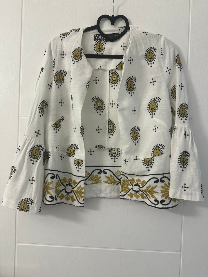 Bol kesim, uzun kollu, düğmeli beyaz mini bluz. Nakışlı bohem desenler ve kesimli yaka detayına sahip. Yumuşak dokulu tekstil kumaşından yapılmıştır.