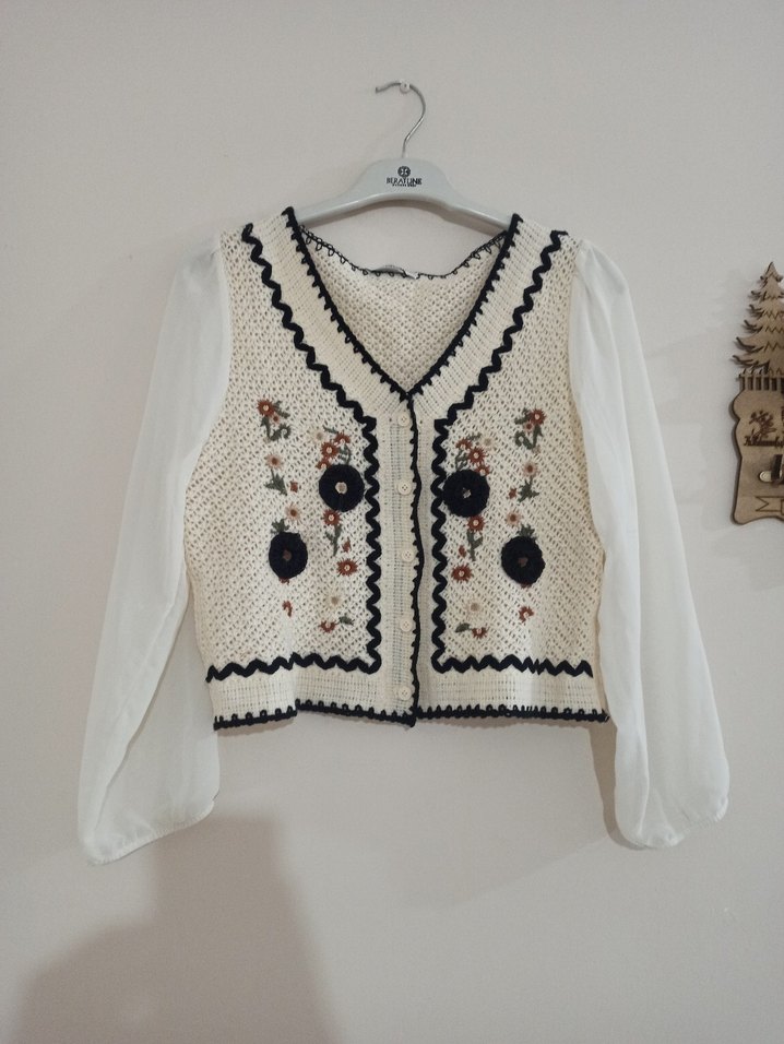 Uzun kollu, V yakalı, nakışlı beyaz örgü bluz. Bol kesim ve kısa boy ile bohem tarzını yansıtır.