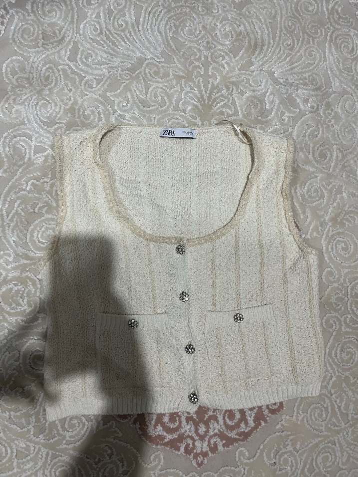 Nakışlı detaylara sahip, beyaz, fitted kesim, kolsuz örgü yelek. Bohem ve rahat tarzda, günlük kullanıma uygun. Hiç kullanılmamış