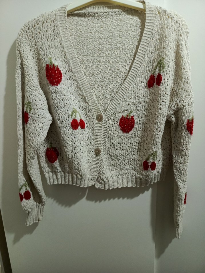 Nakışlı meyve desenli, bol kesim ve uzun kollu açık beyaz triko hırka, bohem tarz için uygun. sondaki düğmesi eksik
