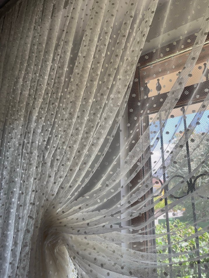 Nakışlı puantiye desenli beyaz tül perde, bohem tarzıyla odanıza zarif bir hava katıyor. Boy 265 En 275 ürünün sıkıntısı yoktur tertemiz krem tonlarında