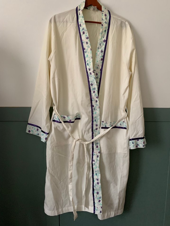 Nakışlı, uzun kollu, bol kesim beyaz sabahlık. Pastel çiçek desenleri ve belden bağlama ipi bulunur. Bohem tarzda, Paris etkili.