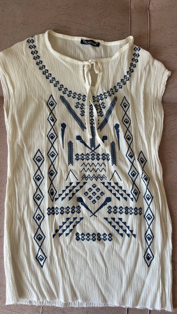 V yaka, kolsuz, nakışlı ve boncuk detaylı hafif beyaz dokuma kumaştan bol kesim hamile tunik. Günlük kullanım için uygundur.