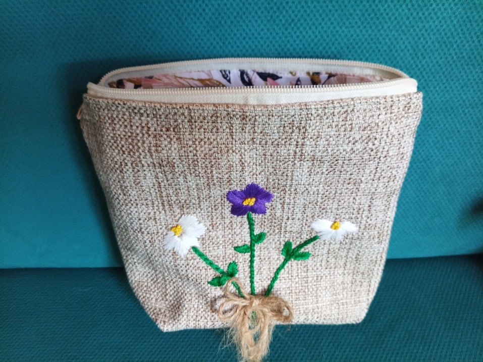 Dokulu kumaş üzerinde nakışlı çiçek desenli, fermuarlı el yapımı bohem tarzı çanta. İç kısmı çiçek desenli kumaşla kaplı. makyaj çantası,cüzdan,organizer olarak kullanılır 21*21 ölçü