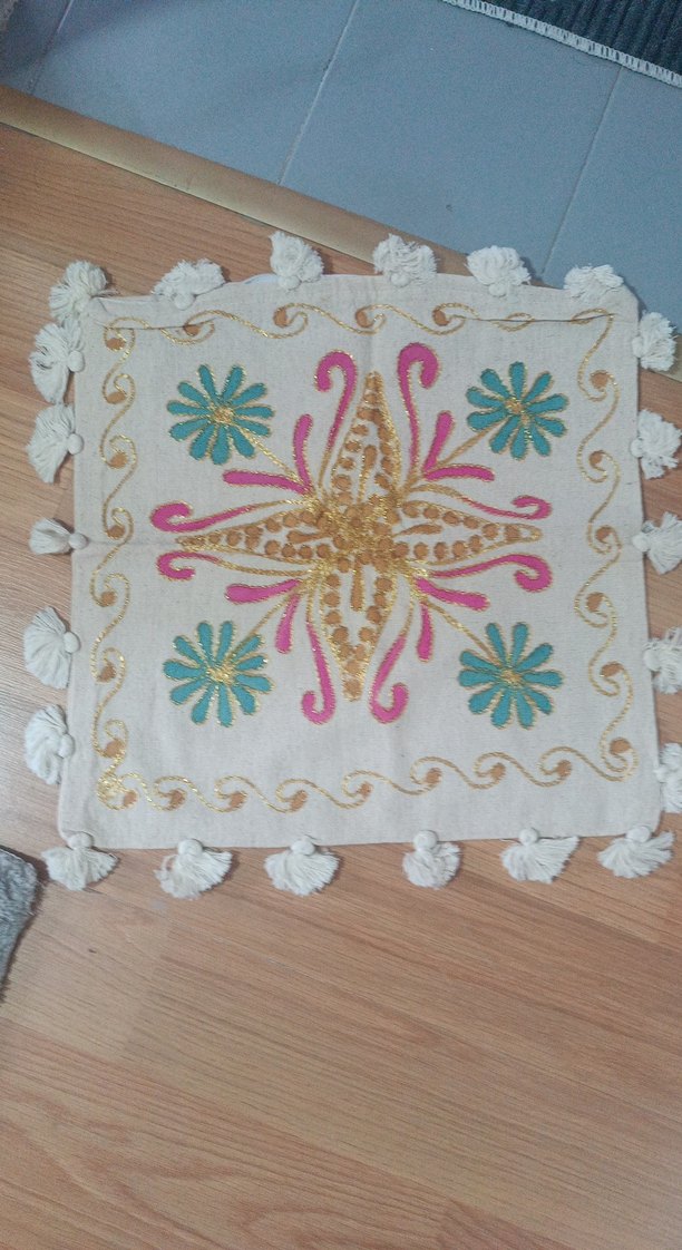 Bohem tarzda, çok renkli nakış işlemeli ve kenarları püsküllerle süslenmiş dekoratif yastık.