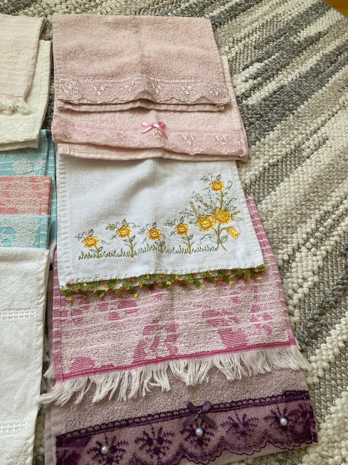 Nakışlı çiçek desenleri ve pastel renklerle bohem tarzda çok renkli havlu seti. Dantel ve püskül detaylarıyla yumuşak ve dekoratif.