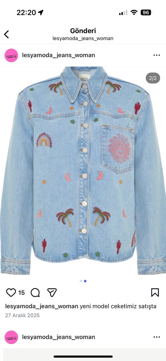 Bu bol kesim kot ceket, uzun kollu ve düğmeli yapıya sahiptir. Notlu yaka ve pastel tonlarda nakış desenleriyle bohem tarzını yansıtır.