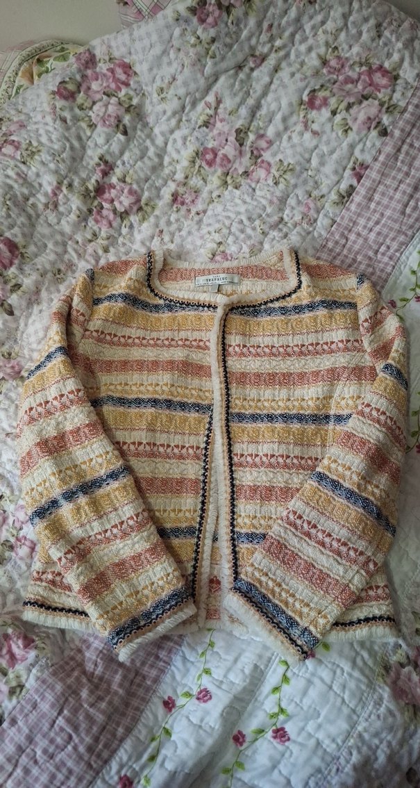 Nakışlı, çok renkli pastel çizgili örgü kumaştan yapılmış, bol kesim ve yakası kesimli bohem tarzında kadın kazak. Zara az kullanilmis