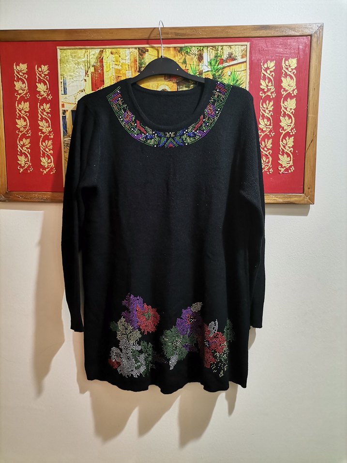 Uzun kollu, bisiklet yaka kadın bluz, nakışlı renkli desenlerle triko kumaştan yapılmıştır. Bol kesim ve uzun boy, bohem tarzını yansıtır.
