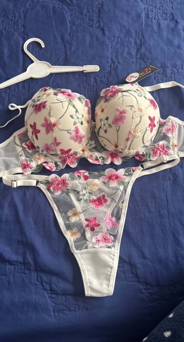 Nakışlı çiçek desenli, pastel beyaz renkte bohem tarzda sütyen ve şeffaf işlemeli tanga takımı.