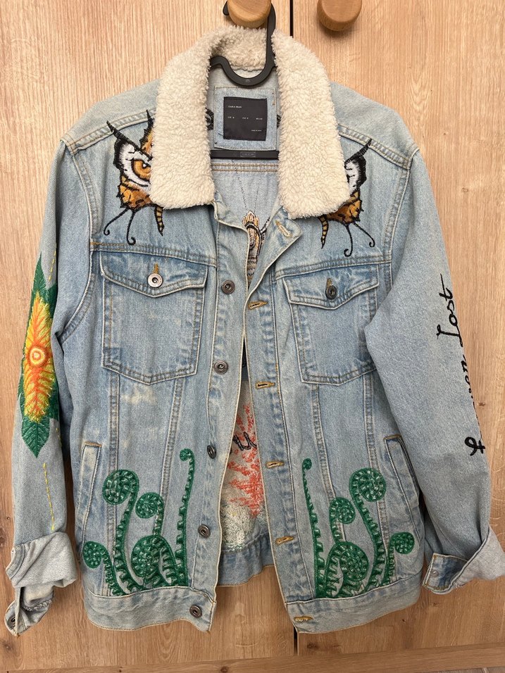 Açık mavi kot ceket, düğmeli, nakışlı bohem desenler, bol kesim, yaka detaylı ve uzun kollu. Sokak tarzına uygun.
