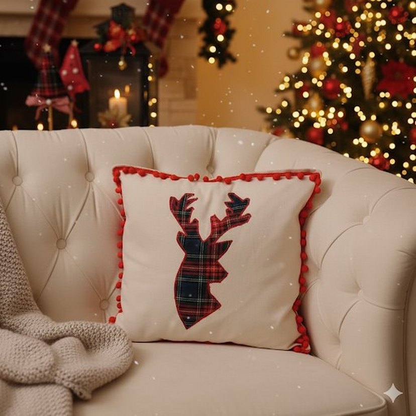 Bohem tarzda, renkli nakışlı geyik desenli ve kırmızı ponponlu yastık. Oturma alanlarına şık ve sıcak bir dokunuş katıyor.