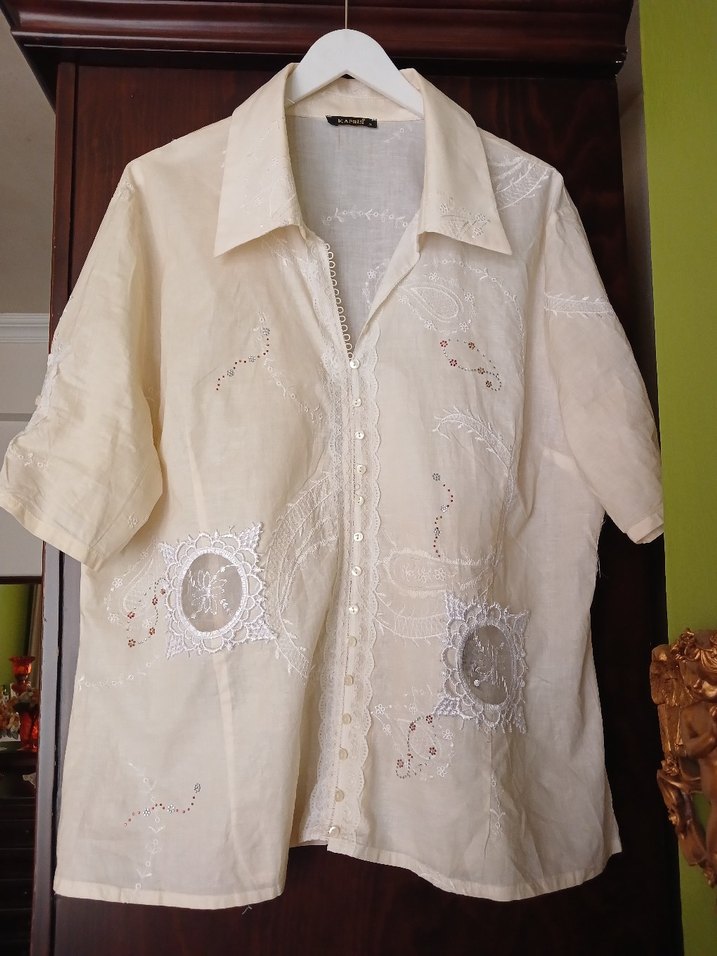 Gevşek kesim krem rengi gömlek, kısa kollu, nakışlı detaylara ve yakalı kesime sahiptir. rengi koyuda ciksa kremdir.Düğmeli önüyle vintage ve bohem tarzını yansıtır. Krem gomlek tek taraf etek genisligi 67 cm omuzdan etek ucuna uzunluk 68 cm koltukaltindan etek ucuna 38cm kolacikligi 29cm omuzdan kolucuna koluzunluk 30cm kolgenisligi 19cm leke sokuk yok sadece son resimde gosterdim dolaptabeklemekten yakasinda belli belirsiz sararma var yikaninca cikar olculere bakarak alim yapiniz iade yoktur zara marka temsilidir