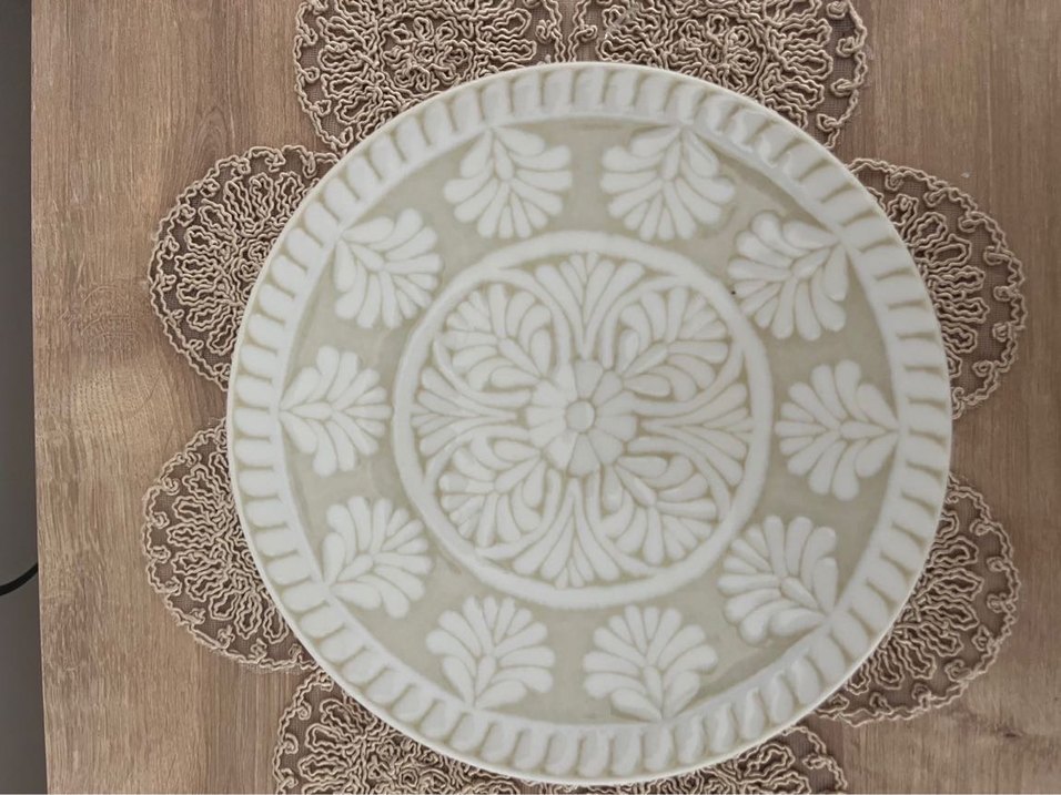 Nakışlı çiçek desenleriyle bej ve gri renkte bohem tarzda tabak. Detaylı tasarımı sofralara özgünlük katıyor. Sayılı kullanıldı fabrika satış mağazasından alındı madame coco marka