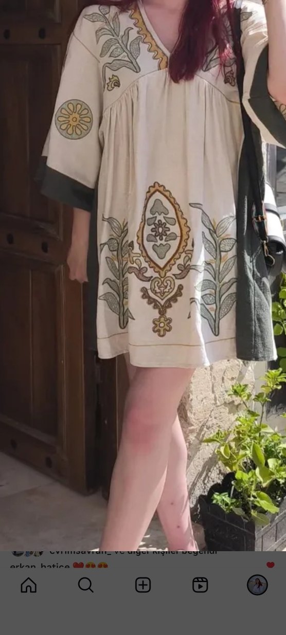 Gri-beyaz tekstil kumaştan, nakışlı ve drapeli, kısa kollu straplez hamile tunik. Bohem tarzda, rahat ve günlük kullanım için uygundur.