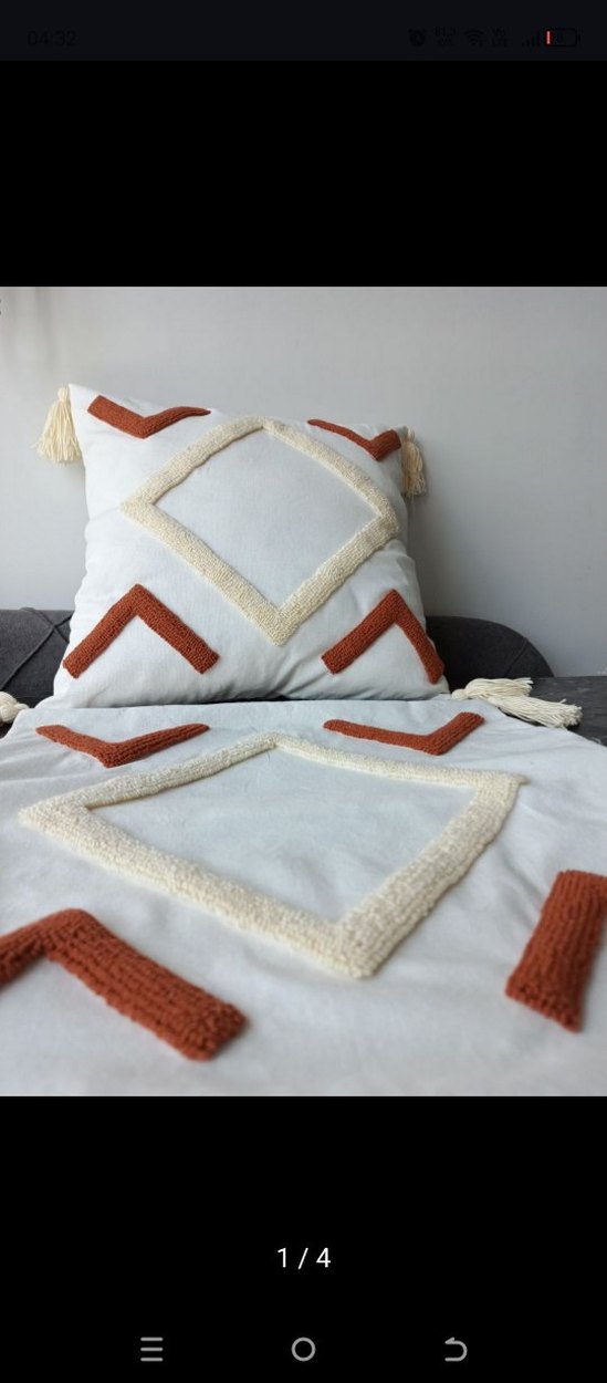 Beyaz ve gri tonlarında, nakışlı geometrik desenli bohem tarzı kırlent ve kılıfı. Köşelerde püsküller bulunur. ️