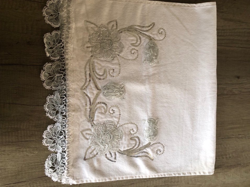 Bohem tarzda, gri nakışlı çiçek desenlerine sahip beyaz havlu, ince dantel kenarlarla tamamlanmıştır.