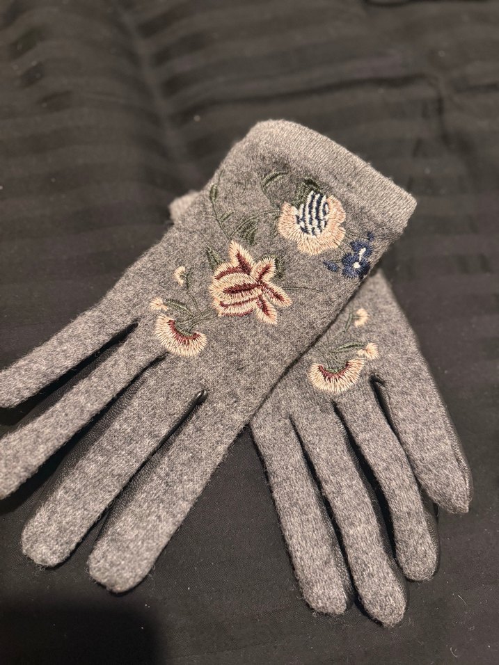 Gri renkli, nakışlı ve örme kadın eldiveni. Rahat ve bohem tarzıyla eski moda bir görünüm sunar.