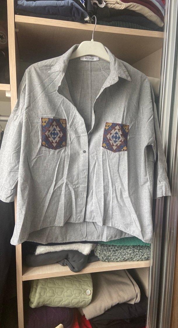 Gri keten gömlek, kısa kollu, yakalı ve nakışlı ceplidir. Düğmeli ve bol kesimdir, bohem tarzına uygundur. bol kalıp