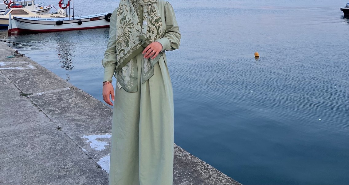 Haki renkli uzun elbise, yüksek yakalı ve uzun kolludur. Nefes alan keten kumaştan, bol kesim ve nakış detaylarıyla bohem ve mütevazı stilde tasarlanmıştır. Bi kaç kere giyildi sağlam 157 boyum 57 kilom elbise bileklerimde