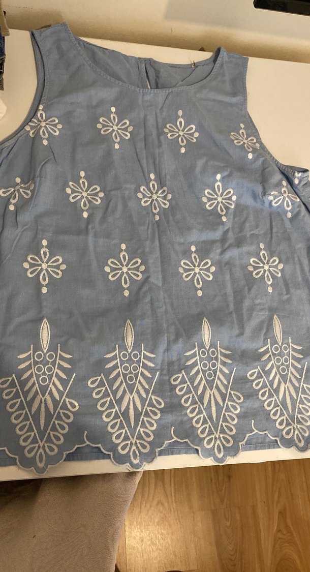 Nakışlı desenlere ve fırfır detaylara sahip, mavi-gri tekstil kumaştan, askısız, kolsuz, bol kesim hamile bluzu. Midi boy ve günlük kullanım için uygun.