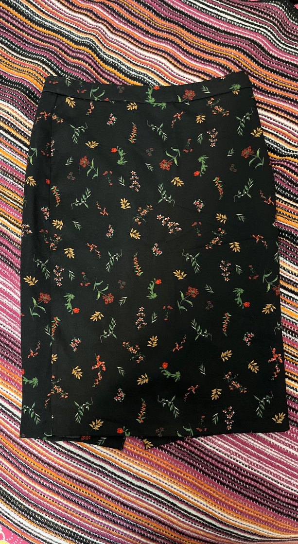 Renkli nakışlı çiçek desenlerine sahip koyu renk midi hamile eteği, drapeli tasarımı ve bohem stiliyle günlük kullanıma uygundur.