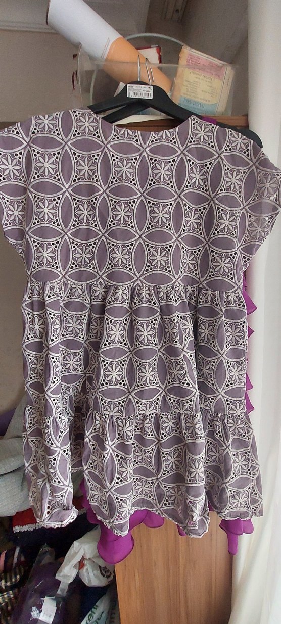 Nakışlı desenli, fırfırlı, V yaka ve askılı kol detaylı bol kesim hamile tuniği. Mor-gri tekstil, midi boy ve bohem tarzda.