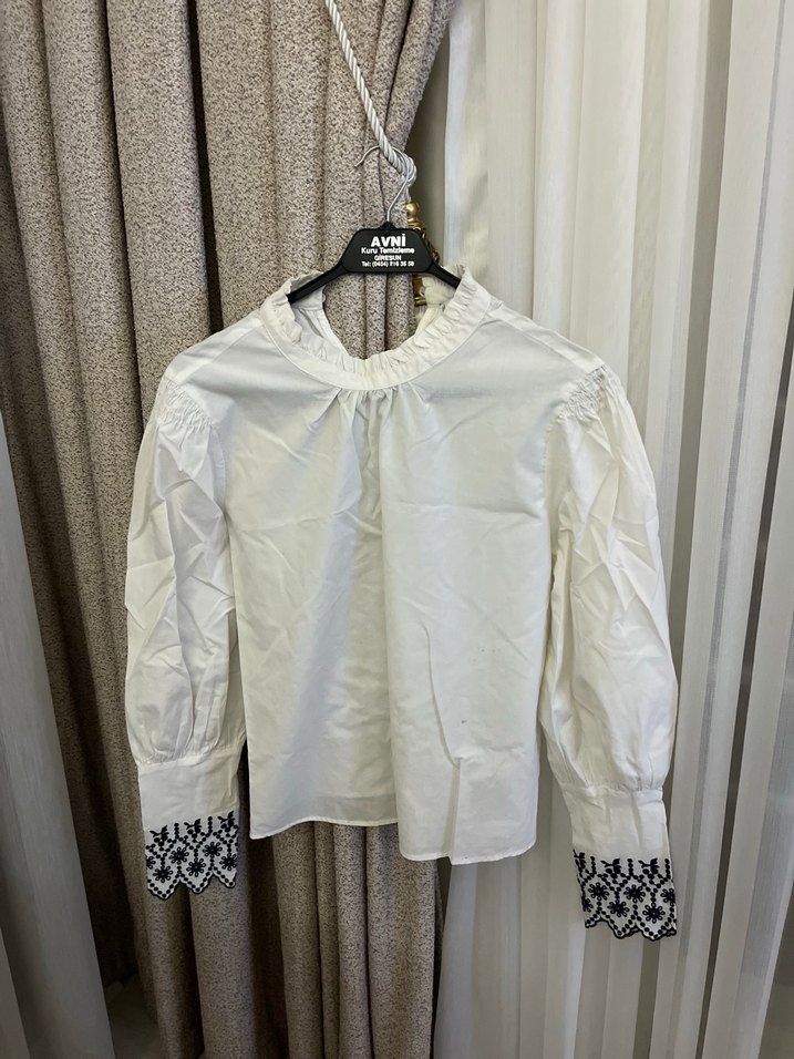 Uzun kollu, yuvarlak yakalı beyaz pamuk gömlek. Manşetlerinde nakış detayları ve düğmeli tasarım bulunur, rahat ve bohem tarzda günlük kullanım için uygun.