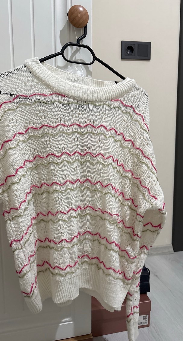 Beyaz renkte, yuvarlak yakalı ve uzun kollu, nakışlı pastel zigzag desenli bohem tarzda triko kazak. Rahat ve bol kesim, günlük kullanım için uygun.