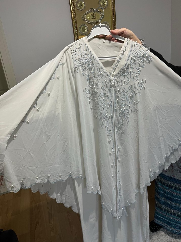 Bol kesim, kısa kollu, uzun beyaz elbise. Bohem tarzda detaylı nakış işlemeleri bulunur. Hafif renkli ve ferah bir görünümü vardır.