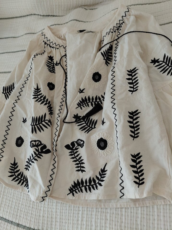 Beyaz kumaş üzerine siyah nakışlı, düğmeli, uzun kollu, bol kesim bohem kadın bluz. Straplez yaka detayı bulunur.