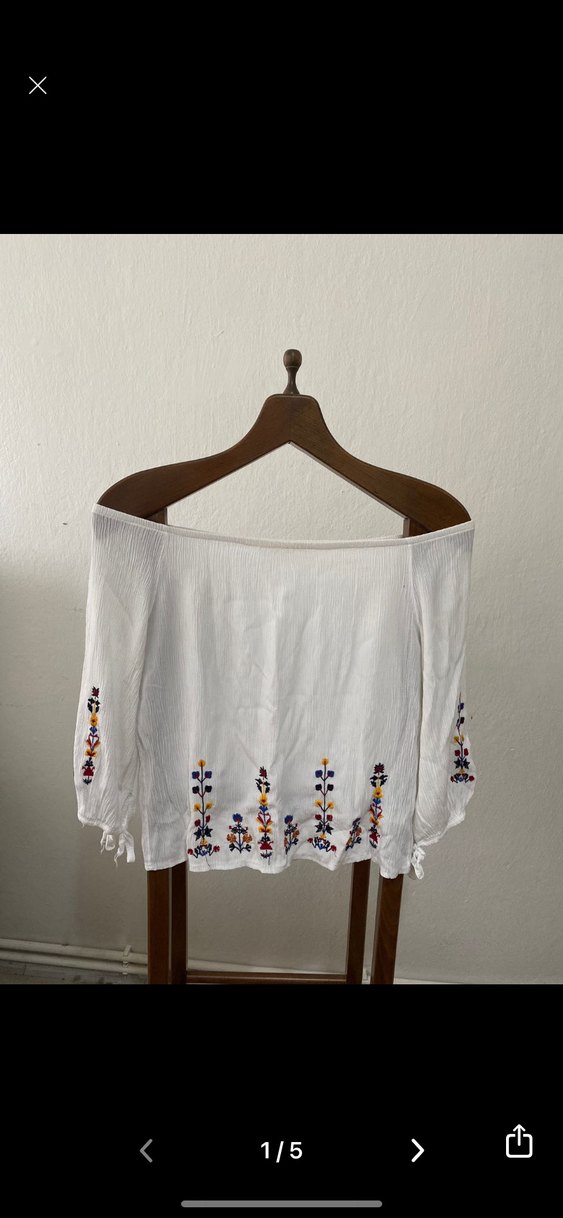 Geniş kesim, kayık yaka ve kısa kollu beyaz bluz, renkli nakış detayları ve drapeli tasarımıyla hafif, günlük kullanım için uygundur.