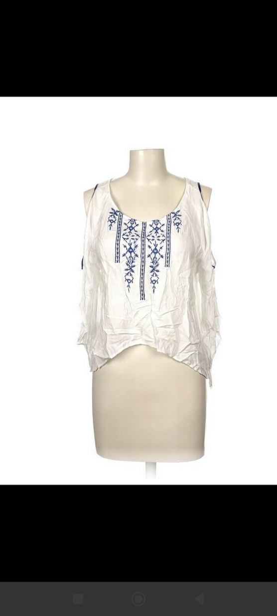 Mavi nakışlı, kolları uzun ,dökümlü ve pamuklu beyaz bol kesim bluz, bohem tarz ,