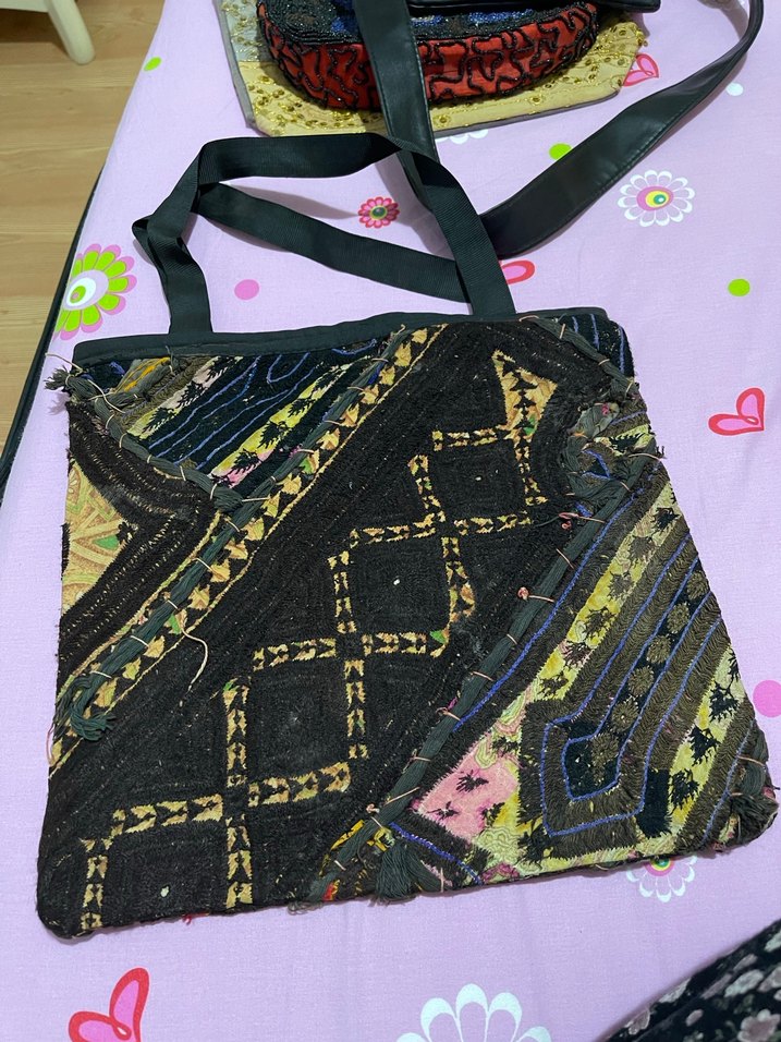 Hiç kullanılmamıştır sadece güneşte kalmış. Nakışlı, koyu renkli çok renkli tekstil malzemeden yapılmış, fermuarlı ve askılı bohem tarzı kadın çantası. Günlük kullanım için uygundur.