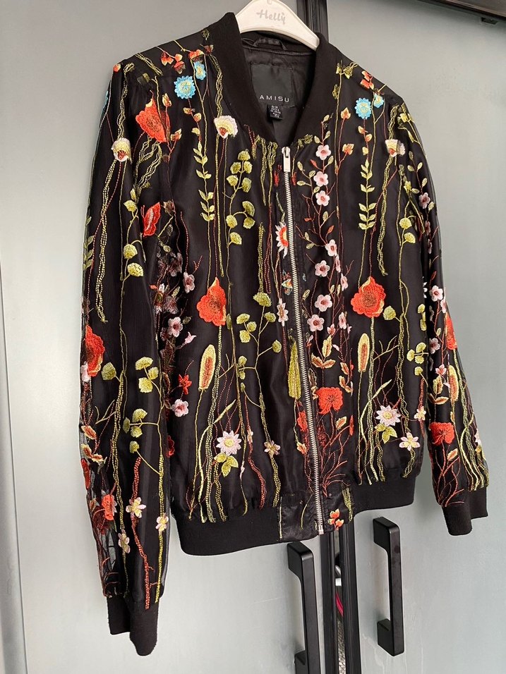 Renkli çiçek nakışlarıyla süslenmiş koyu renkli tekstil kumaştan bohem tarzı kadın ceket. Bol kesim, uzun kol, çentikli yaka ve fermuarlı ön kapama özelliklerine sahiptir.