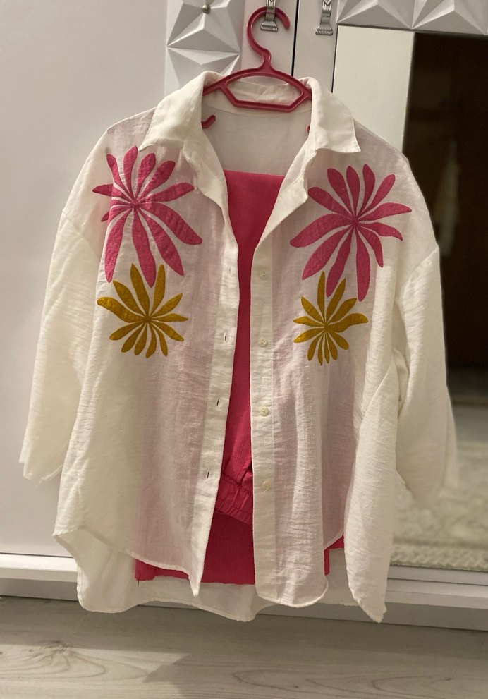 Uzun kollu, düğmeli, nakışlı bohem tarzı bol kesim kadın gömlek. Yumuşak dokulu tekstil, pembe askısız iç katman ile.