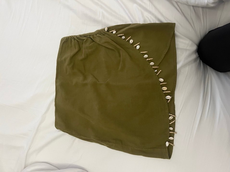 Bu uzun, bol kesim hamile eteği, parlak haki renkte nakışlı detaylarla drapeli bohem tarzı yansıtıyor.