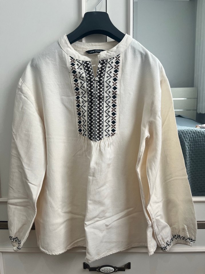 Uzun kollu, nakışlı beyaz keten bluz. Yuvarlak yakalı ve düğmeli, rahat kesim bohem tarzı günlük kullanım için ideal.