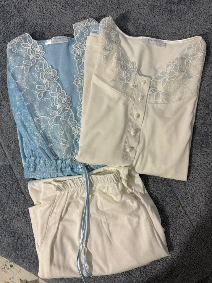 Nakışlı detaylara sahip, bohem tarzda, pastel beyaz ve mavi renklerde, uzun kollu ve bol kesim pijama takımı. Lohusa zamanında hastanede giymek için aldım ama 1 kere dahı giyemedim şuanda da kilom sebebiyle giyemiyorum tertemiz yeni hiç bir yerinde kusur yoktur.