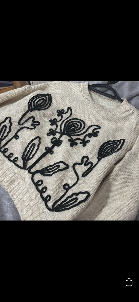 Beyaz renkte, nakışlı çiçek desenlerine sahip, yuvarlak yakalı, uzun kollu, bol ve kısa kesim bohem tarz kadın triko kazak.