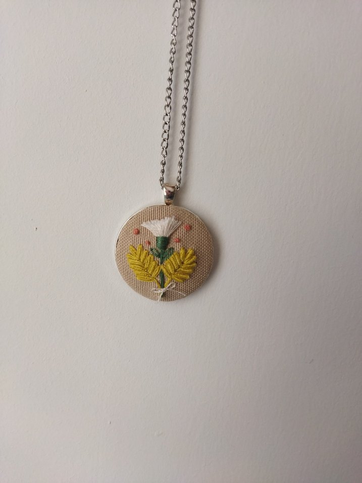 Bej zemin üzerine nakışlı, boncuk işlemeli renkli çiçek detaylı bohem tarz kadın kolye. Orta uzunlukta zincire sahip, günlük kullanıma uygun. #kanaviçe #nakışlıkolye #kolye #vintage #yeniürün #takı #kanaviçetakı