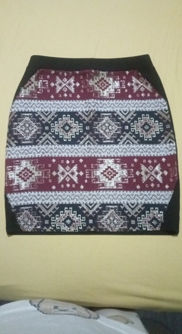 Nakışlı, örme desenli, koyu çok renkli bohem tarzda, sentetik kumaştan, midi boyda, dar kesim kadın mini etek.