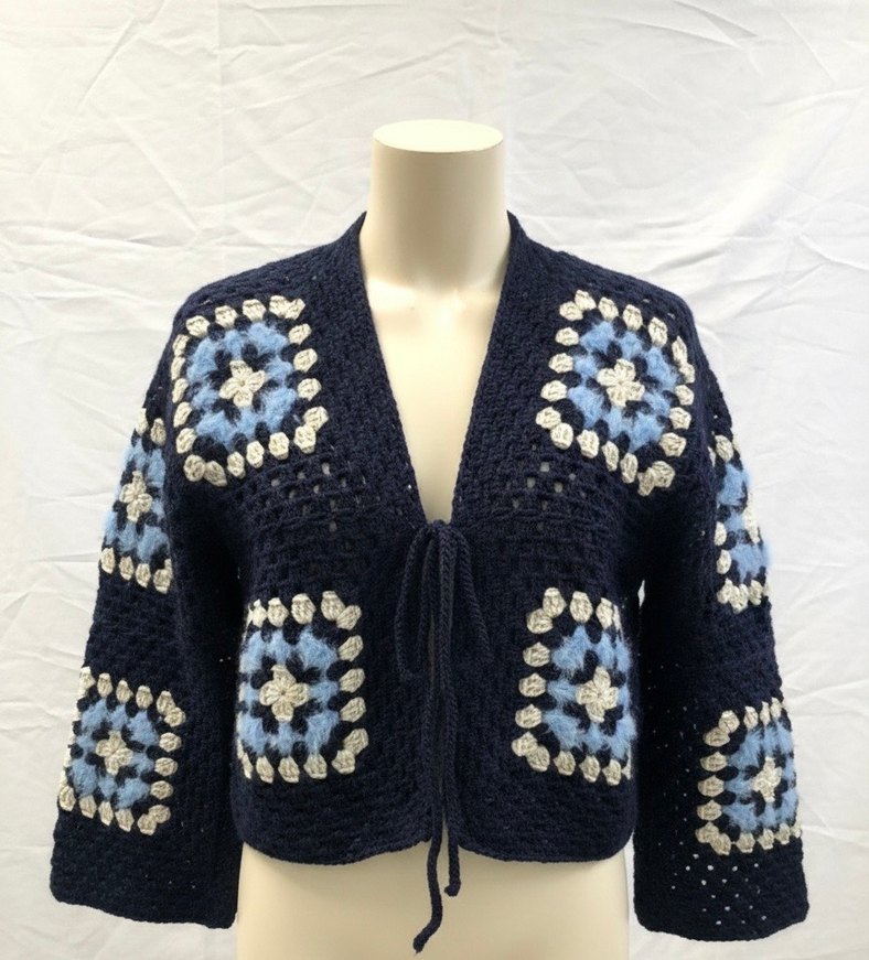 Nakışlı desenlere sahip, koyu mavi renkli, bol kesim kadın triko hırka. Uzun kollu ve yakası çentikli, bağcıklı kapanışlıdır. Rahat bohem tarz sunar.