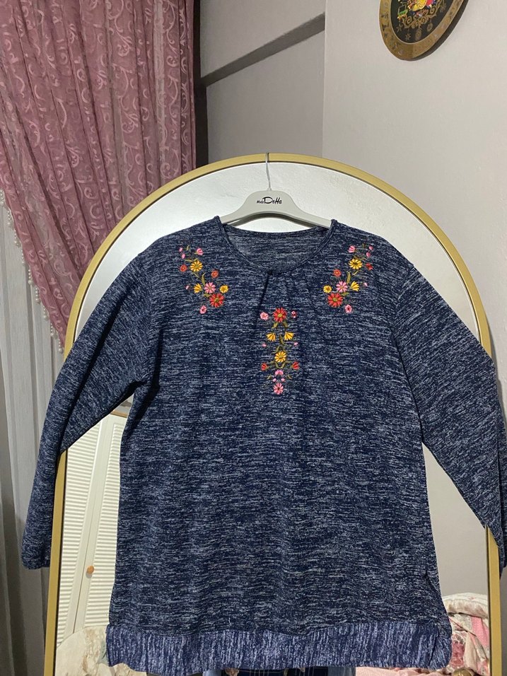 Mavi-gri renkte, nakışlı, uzun kollu, yuvarlak yaka, bol kesim triko kadın kazak. Rahat ve bohem tarz için uygundur.