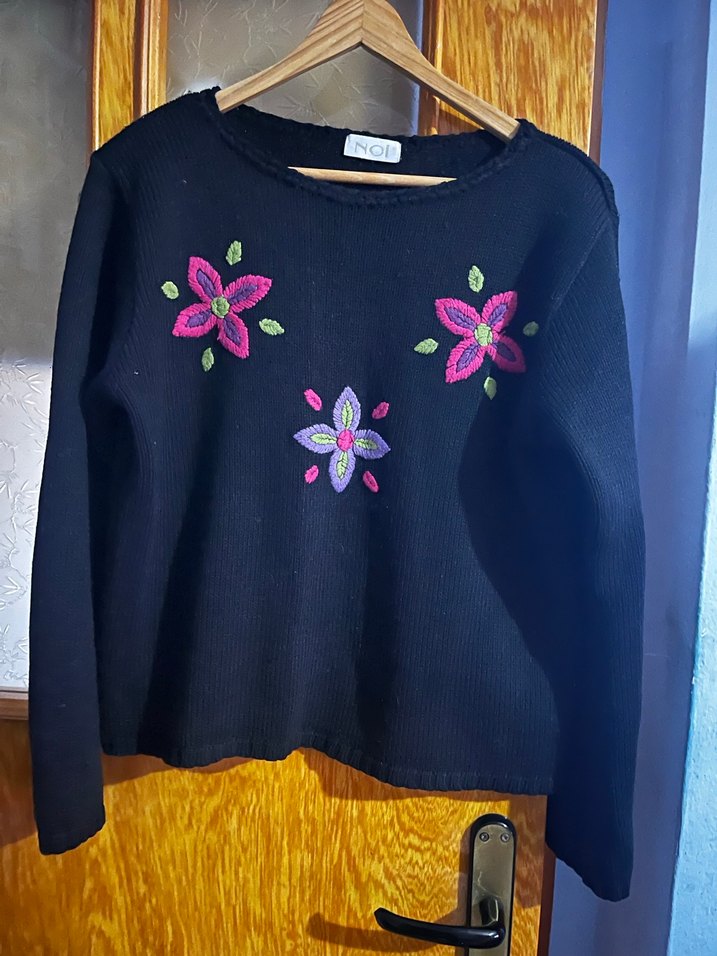 Koyu renkli, çok renkli nakışlı çiçek desenlerine sahip uzun kollu, yuvarlak yaka triko kazak. Bohem tarzda, rahat ve midi boyda.